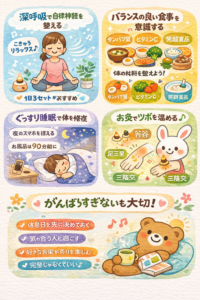 深呼吸、食事、睡眠、お灸、そして心のゆとり。